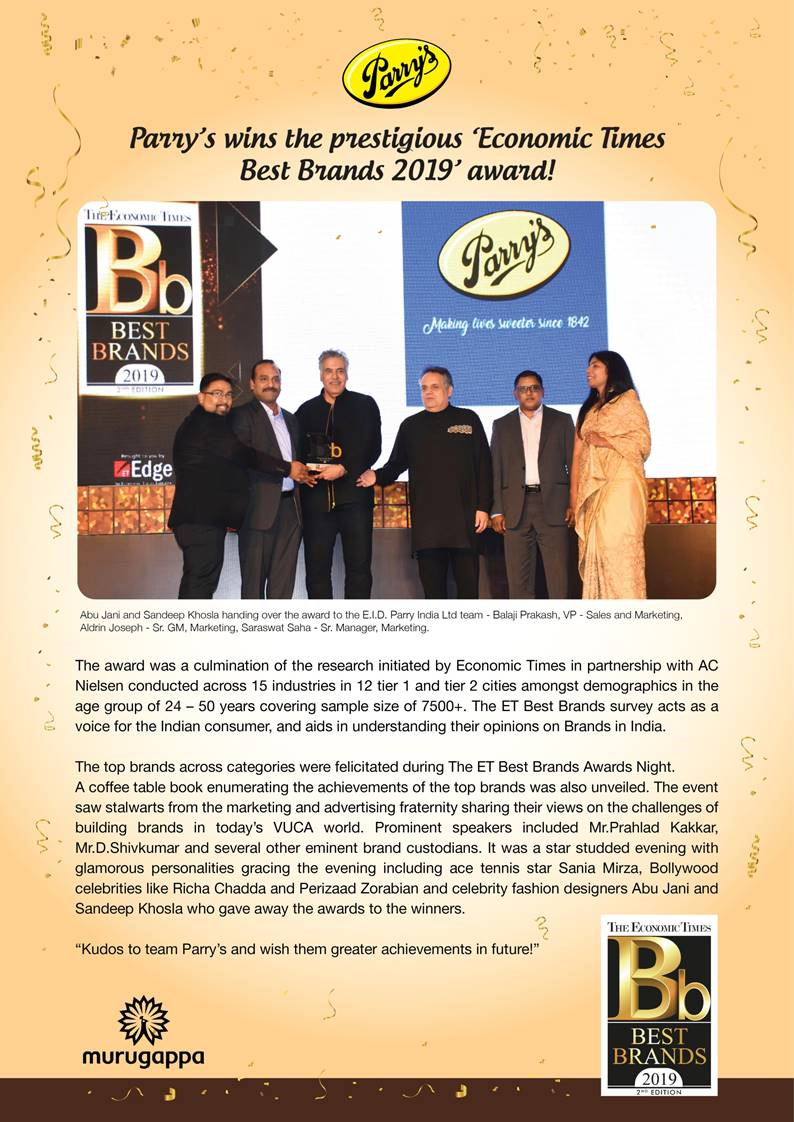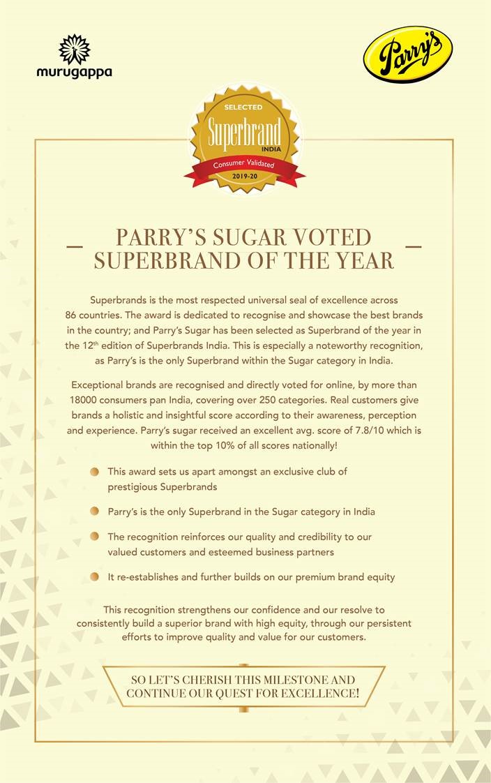 E.I.D. – Parry (India) Limited is a listed company engaged in the business of Sweeteners and Nutraceuticals. Headquartered in ‘Dare House’ a heritage building, in Chennai, India, the Company is a part of the INR 778 Billion Murugappa Group, one of India’s leading business conglomerates.